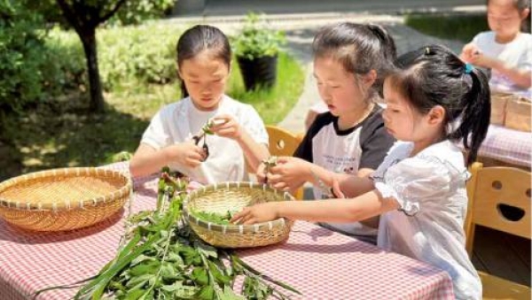孩子们正在收获亲手种植的艾草