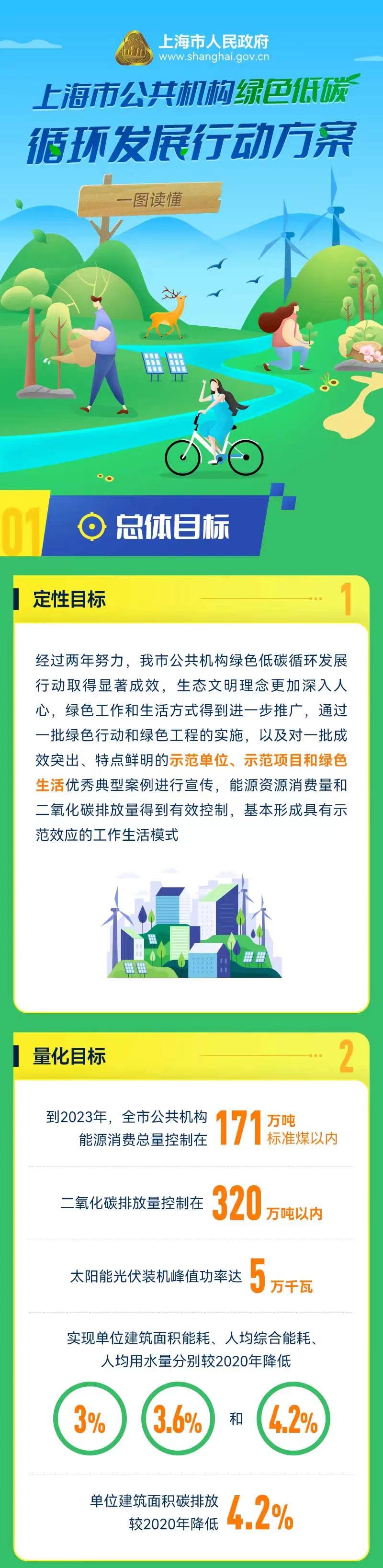 《行动方案》明确,到2023年,全市公共机构能源消费总量控制在171万吨标准煤以内,二氧化碳排放量控制在320万吨以内,太阳能光伏装机峰值功率达5万千瓦,预估年发电约5000万度电。实现单位建筑面积能耗、人均综合能耗、人均用水量分别较2020年降低3%、3.6%和4.2%,单位建筑面积碳排放较2020年降低4.2%。
