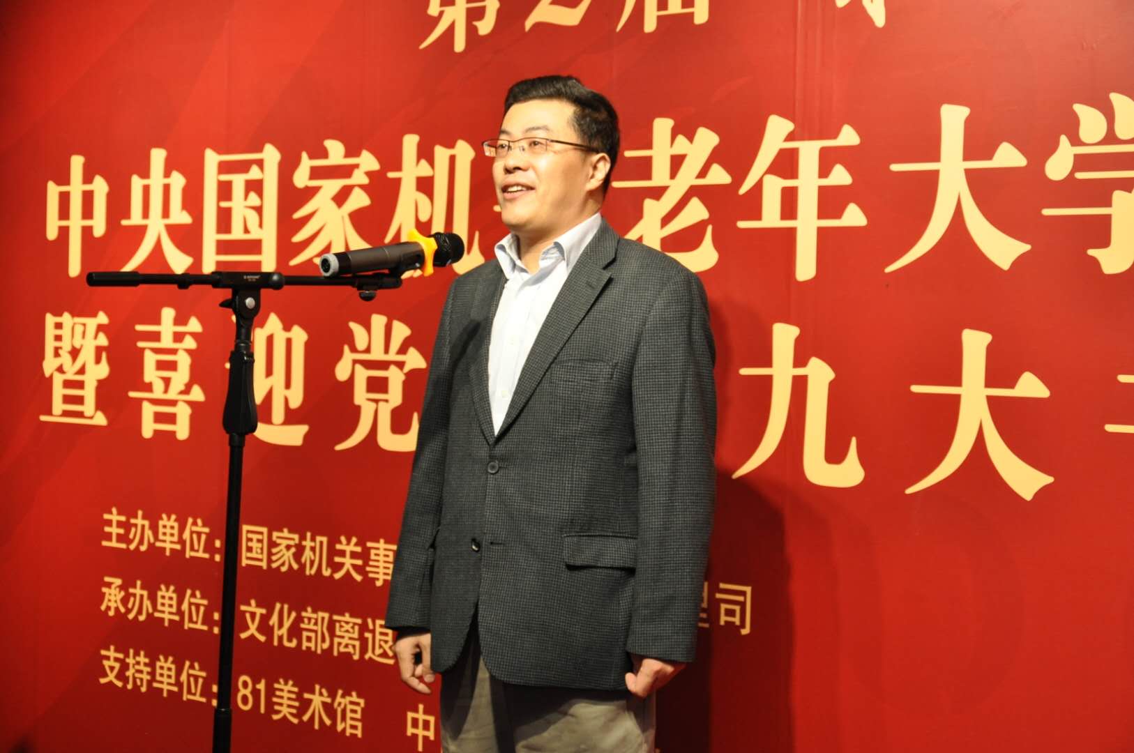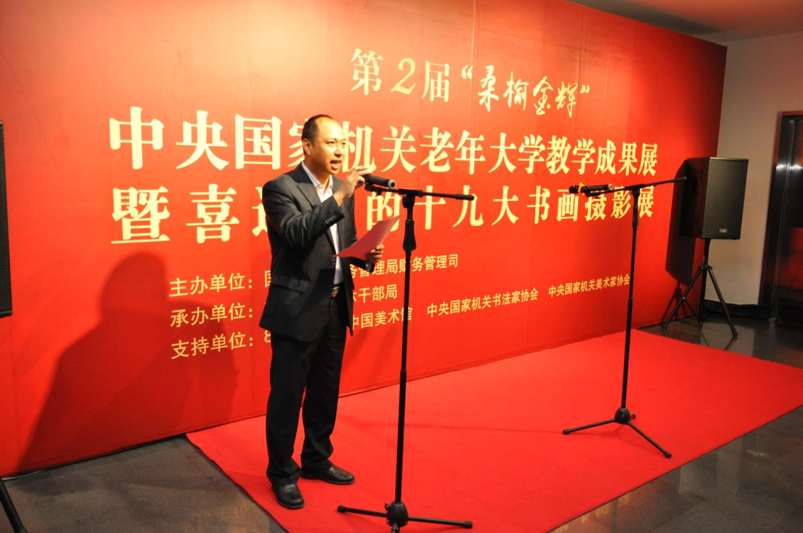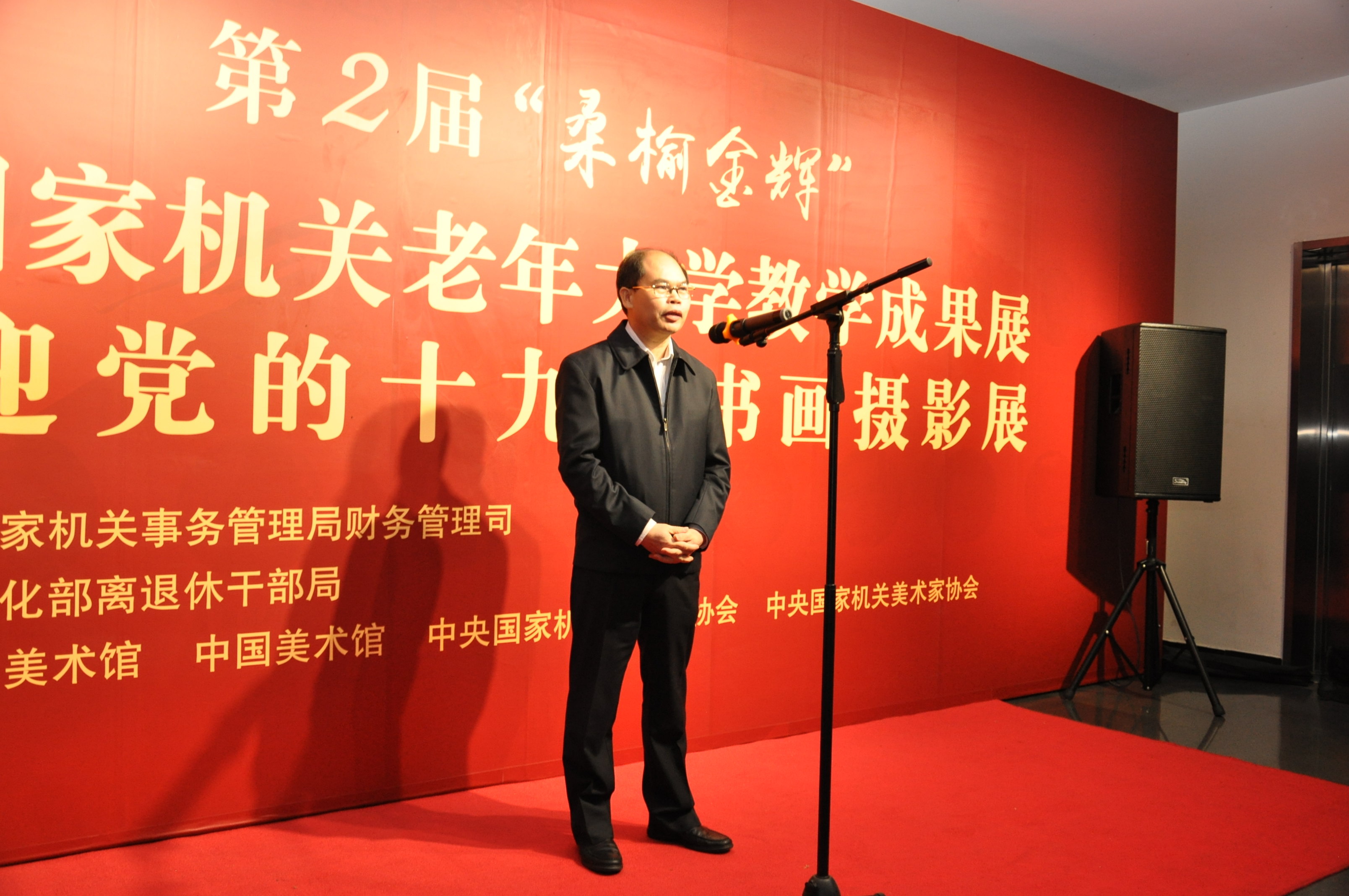 国家机关事务管理局财务管理司司长王德在致辞中谈到,党中央、国务院高度重视老干部工作,习近平总书记多次作出重要批示、发表重要讲话,强调要加强老干部活动阵地和学习阵地建设,更好地满足老干部的精神文化生活需求,引导老同志保持老骥伏枥、老当益壮的健康心态和进取精神,发挥正能量,作出新贡献。党的十八大以来,在以习近平同志为核心的党中央坚强领导下,在中组部、财政部、民政部等有关部门的指导下,在中央国家机关各部门党组的领导下,各部门加强学习阵地建设,积极成立老年大学,加大经费保障力度,优化课程设计,改善教学条件,配强师资力量,丰富了老同志的晚年生活,改善了老同志的生活品质,老年大学教育工作取得了显著成绩。此次书画摄影展,是中央国家机关离退休老同志为喜迎党的十九大献上的一份厚礼,是老年大学学员讴歌党的丰功伟绩、歌颂祖国伟大成就的一种重要方式,是离退休同志老有所学、学有所成的一次成果展示,也是老年大学教学工作互相交流的一个重要平台。